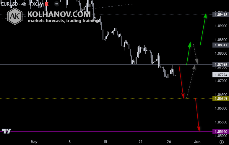 The downtrend may be expected to continue, while market is trading below resistance level 1,0759, which will be followed by reaching support level 1,0635 and if it keeps on moving down below that level, we may expect the market to reach support level 1,0516.