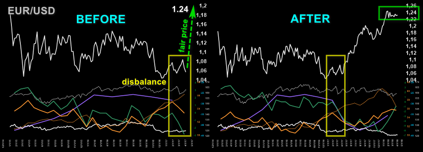 For example, EUR/USD is being traded at 1.06, but the shift in the economic indicators of the market assessment shows that the level of 1.24 has become the fair price, which means that the price of 1.06 has already become the imbalance price and soon the market will go up from 1.06 to 1.24, towards the fair price.